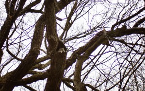While walking the dog at a city park, we saw a couple standing together, looking up to a tree together and smiling together. Our dog started playing with their dog, so we paused next to them. They, without looking away from the tree, told us that there was an owl up there.