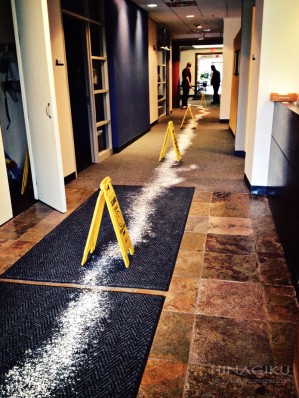 This trail of white powder started in one of the two elevators. It was halted on the first floor with its door open. The powder went all the way to the front entrance of the building, then out through the glass doors.